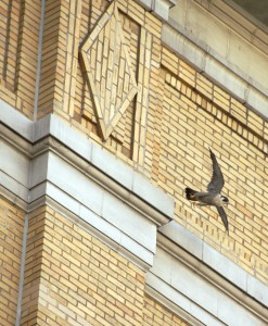If you’re a regular High Line visitor you know the magnificent peregrine falcon who has taken up residence at the Drug Enforcement Agency building on 17th Street. I’ve been photographing this bird for more than a year, and a few months ago saw him perched with his mate. Occasionally he cries out in piercing bursts, but lately he’s been sitting very quietly for hours at a time, watching the world go by. Today I caught him leaping off his ledge to go soaring over the Hudson River.